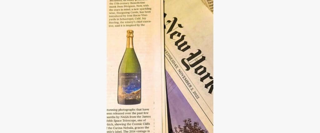 Our latest accolades include being written up in the New York Times for the newly released 2014 Stargazing, which Florence Fabricant included in her Front Burner column. She described it as: “… pale gold… (with) a fine mousse, lovely toasted notes mingled with white peach and a finish that lingers. Raise a holiday glass of give as a gift”.