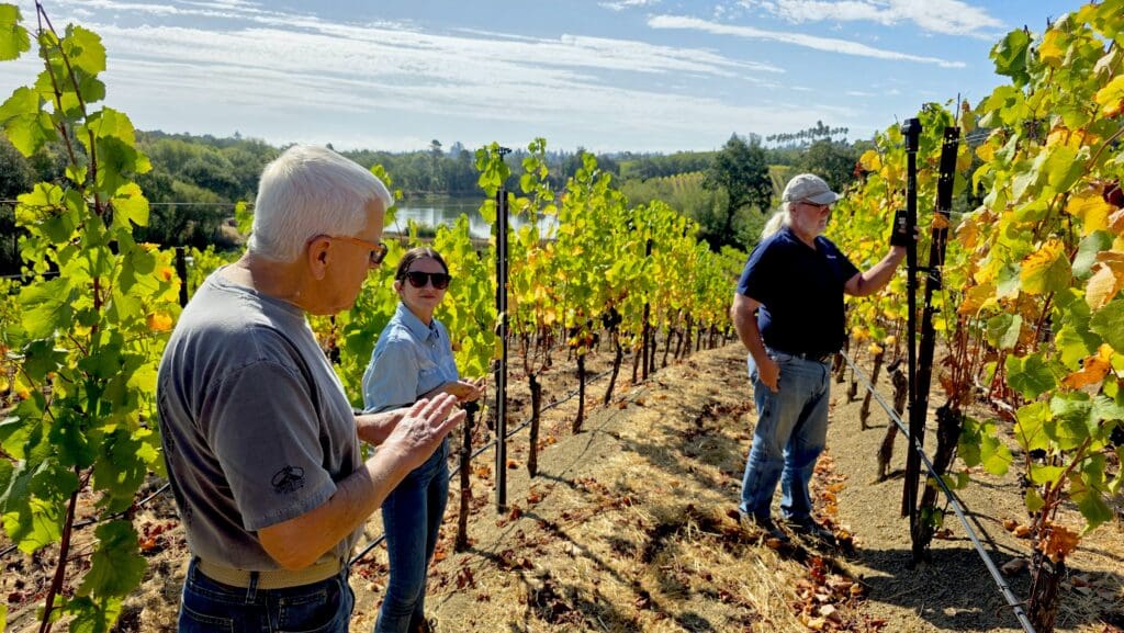 Winemaker David Munksgard, Crop Care Scout Emily Panovich and UCSD Senior Research Scientist John Graham