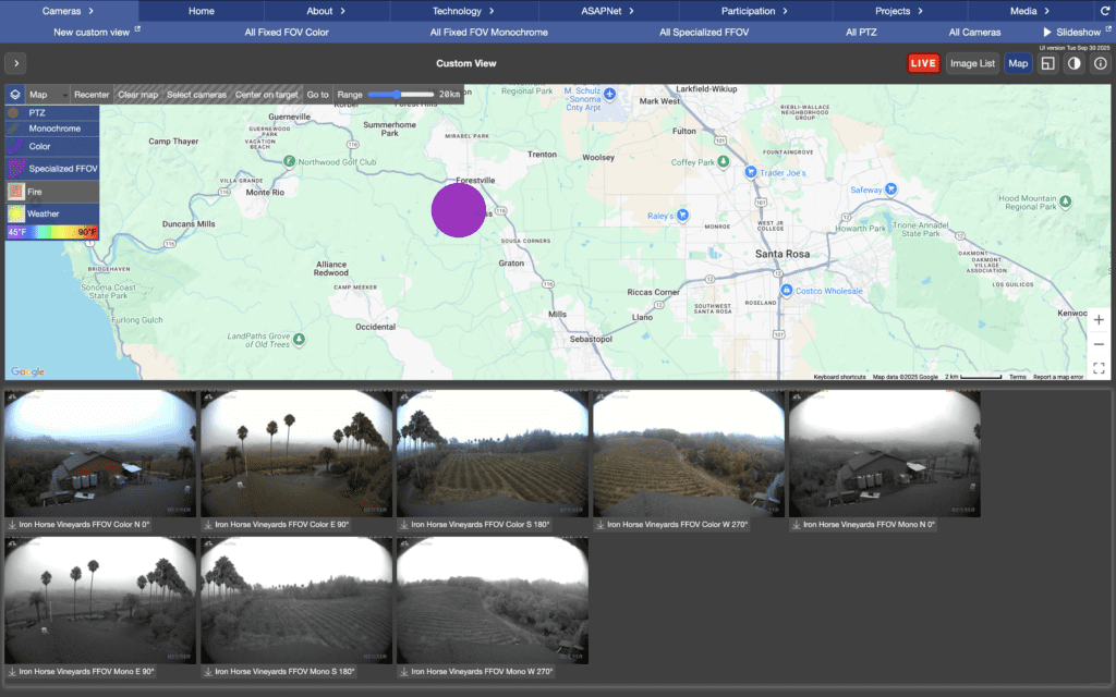 Today, that testbed has become a living laboratory for precision agriculture. It brings together a 10 Gbps fiber network, LoRaWAN antennas and vineyard sensors, drone and 360-degree imaging, environmental monitoring for fog, rain, humidity, and CO₂, and fire cameras connected into the state wildfire-alert network. Together, these systems allow us to track the vineyard in real time, at a level of detail and extent that simply was not possible before.