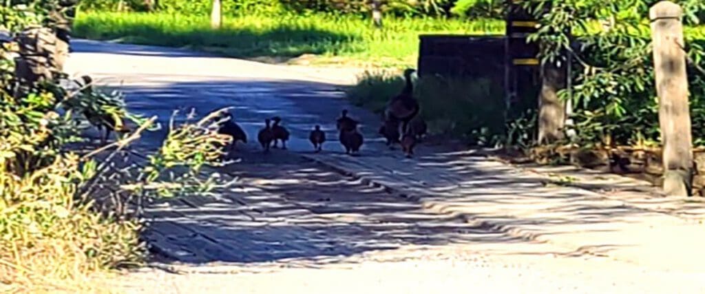 This time of year, you can expect some delays on our road: My commute home the other evening was held up by a little family of turkeys walking across the bridge.